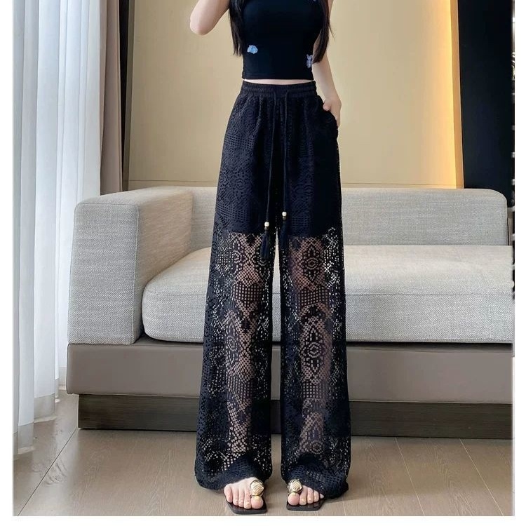 重工蕾絲鏤空設計 經典黑色不挑搭配,高腰闊腿版型拉長比例,百搭時尚,面料舒適,氣質減齡!