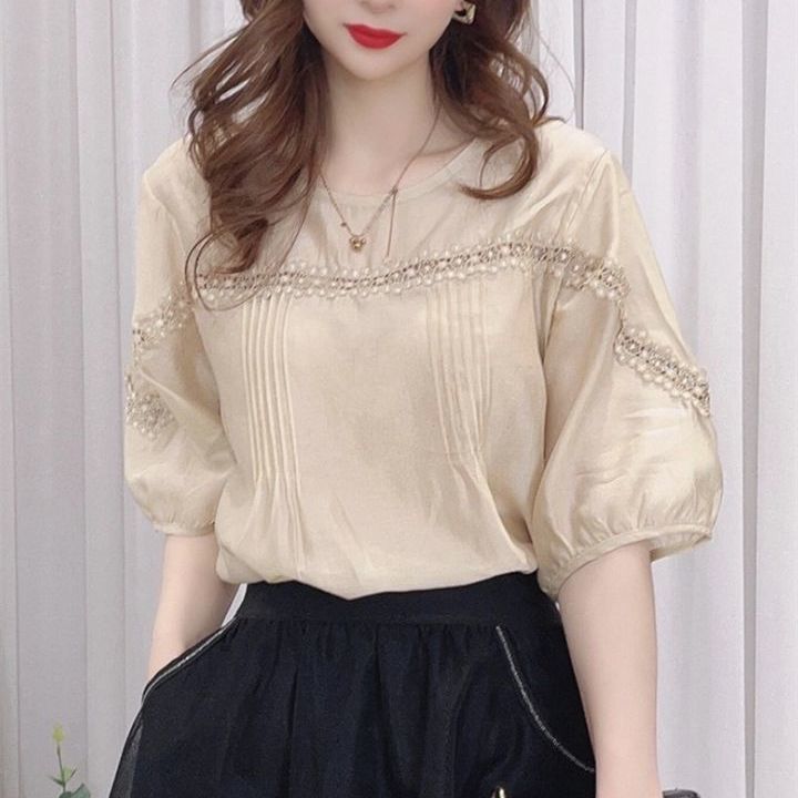 港風復古蕾絲拼接半袖雪紡衫2026夏新款法式寬鬆顯瘦上衣潮女